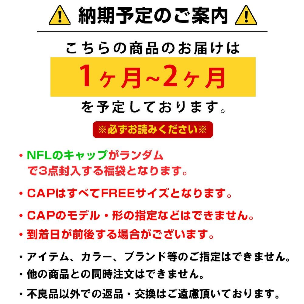 他の画像を見る 創業30年目突入記念!NFL キャップ 3点セット福袋! NFL キャップ3点セット 福袋 創業30年目突入記念 創業祭 福袋 ¥ 16,500 税込 カートに入れる お気に入りに登録する