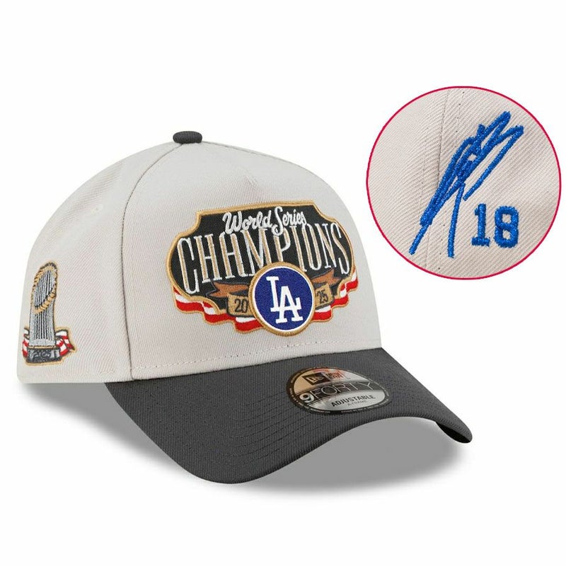 関連キーワード[キャップ][帽子][【海外カスタム品】2025 World Series Champions Locker Room A-Frame 9FORTY Adjustable Hat (Royal Player Sign/Royal Number)][Los Angeles Dodgers][Yoshinobu Yamamoto #18][Cream/Charcoal][メジャーリーグ 大リーグ][LAD]