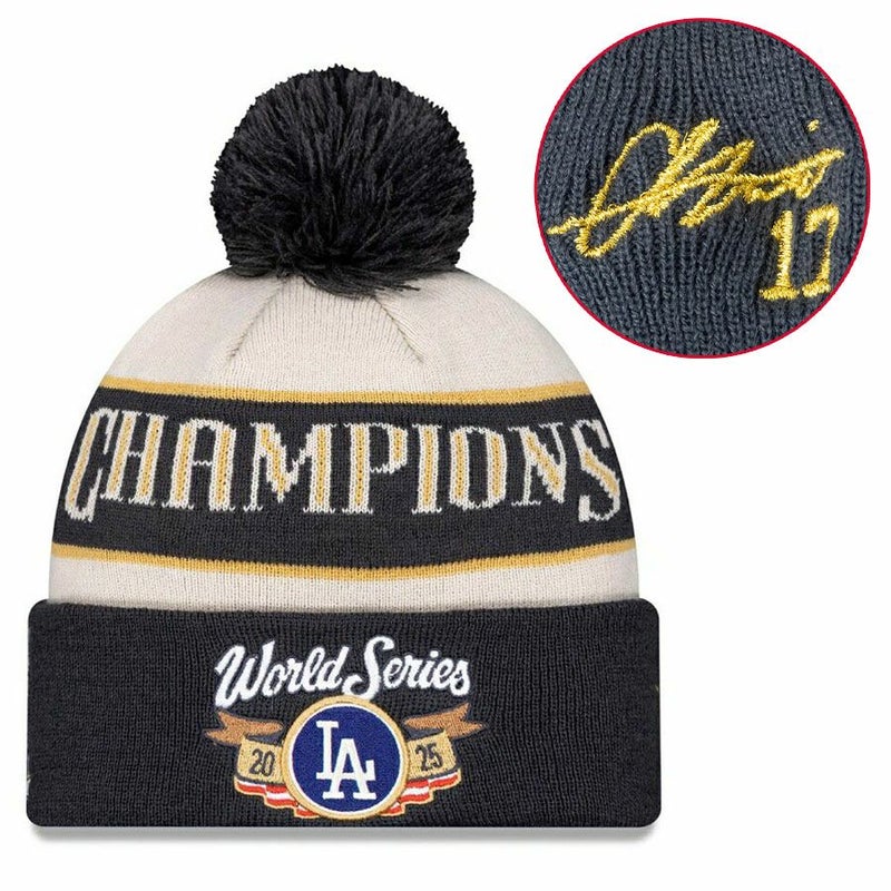 関連キーワード[キャップ][帽子][【海外カスタム品】2025 World Series Champions Locker Room Cuffed Knit Hat with Pom (Gold Player Sign/Gold Number)][Los Angeles Dodgers][Shohei Ohtani #17][Cream/Charcoal][メジャーリーグ 大リーグ][LAD]