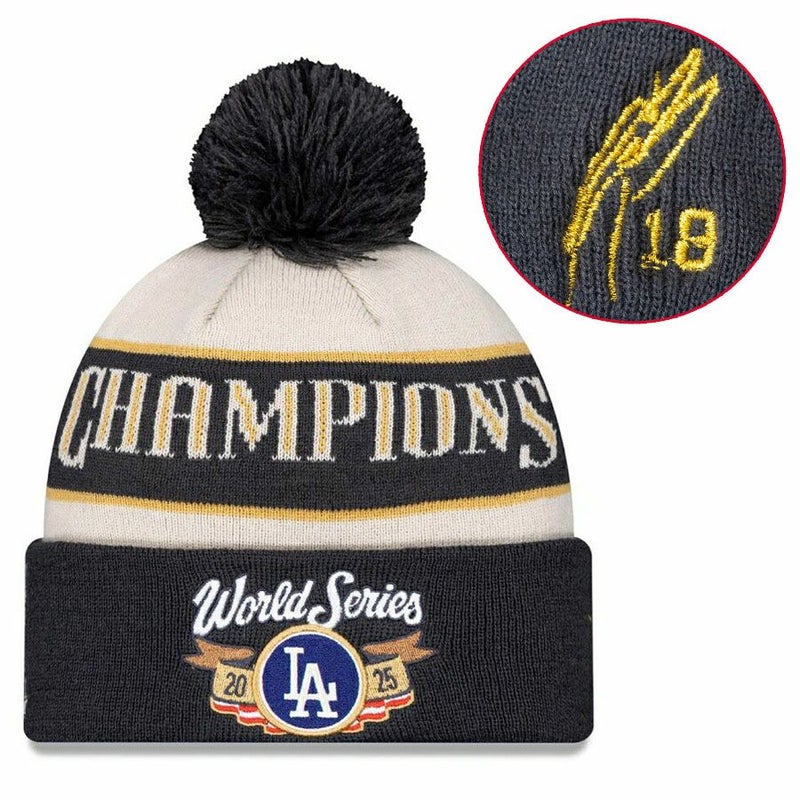 関連キーワード[キャップ][帽子][【海外カスタム品】2025 World Series Champions Locker Room Cuffed Knit Hat with Pom (Gold Player Sign/Gold Number)][Los Angeles Dodgers][Yoshinobu Yamamoto #18][Cream/Charcoal][メジャーリーグ 大リーグ][LAD]