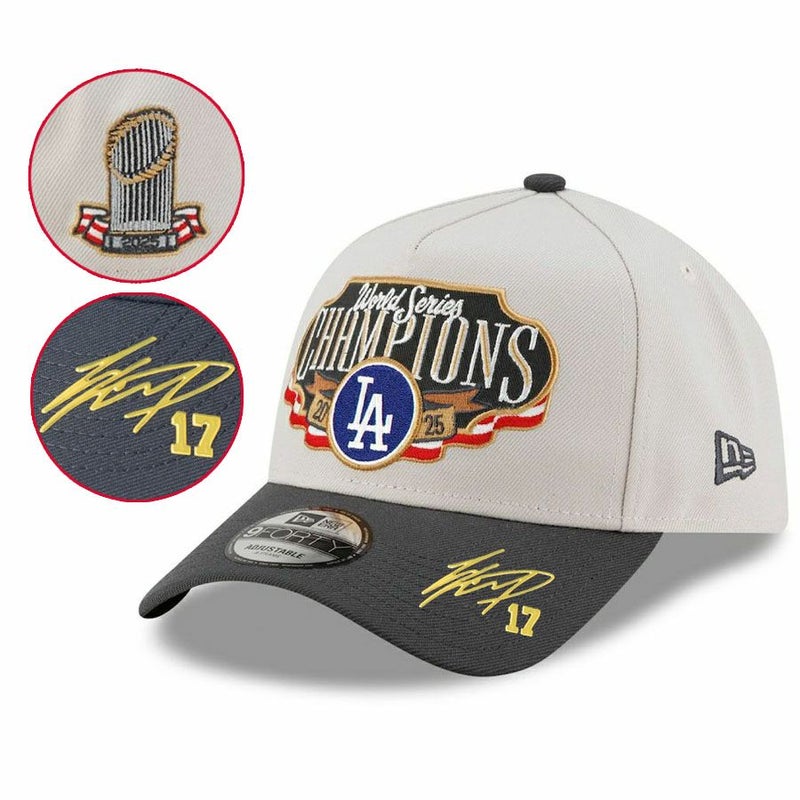 関連キーワード[キャップ][帽子][【海外カスタム品】Chrome Patch 2025 World Series Champions Locker Room A-Frame 9FORTY Adjustable Hat (Gold Player Sign/Gold Number)][Los Angeles Dodgers][Shohei Ohtani #17][Cream/Charcoal][メジャーリーグ 大リーグ][LAD]