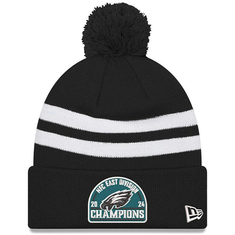 NFL イーグルス ニットキャップ 2024 NFC 東地区 ディビジョン優勝記念 Striped Cuffed Knit Hat with Pom ニューエラ/New Era ブラック