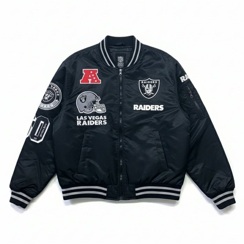 レイダースのチームカラーであるブラックを基調とした、ミリタリーテイストのボンバージャケットです。