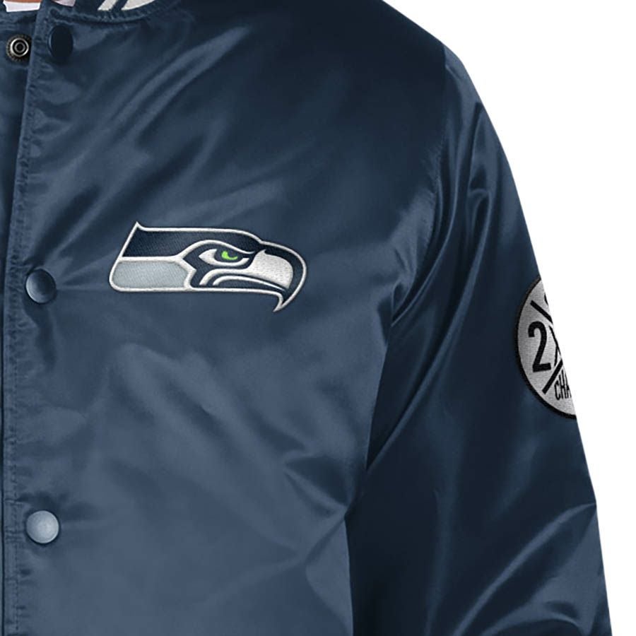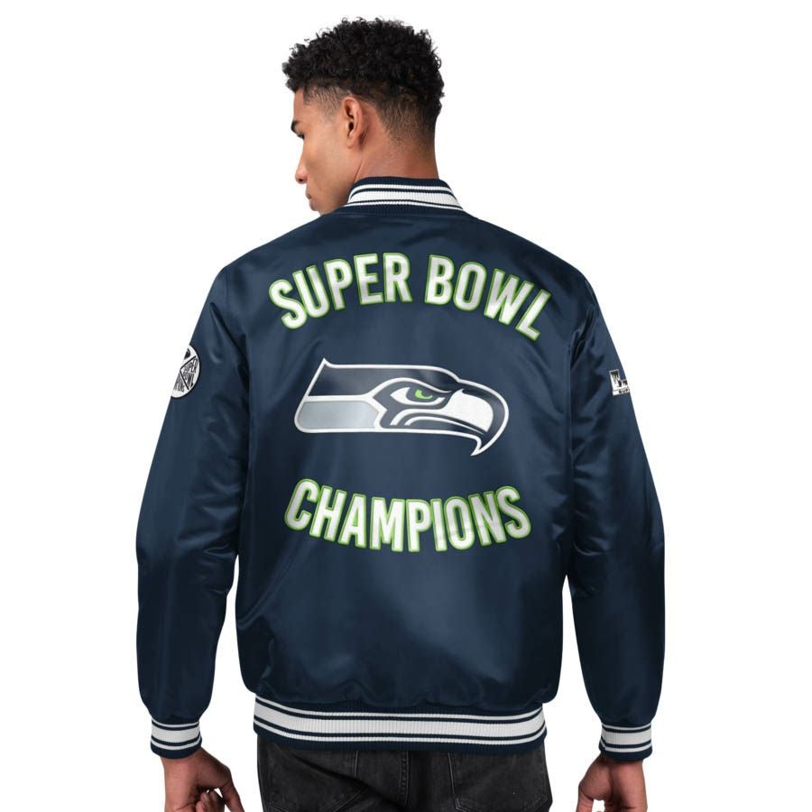 第60回NFLスーパーボウル優勝記念アイテム NFL シーホークス ジャケット 第60回スーパーボウル 優勝 連覇 2x バーシティー サテン スタジャン STARTER カレッジネイビー
