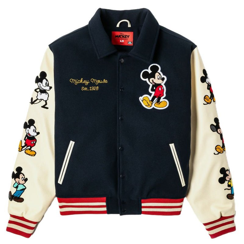 クラシックなミッキーアイコンをモチーフにしたデザインが特徴のバーシティジャケット。