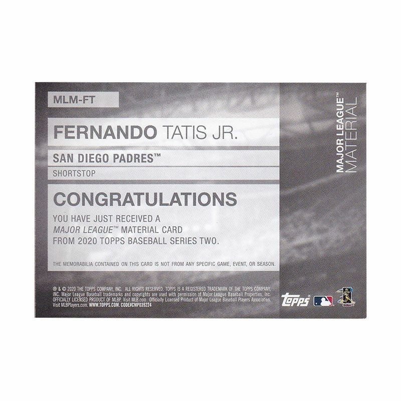 他の画像を見る 実使用バット入り!タティスJr選手 トレーディングカード MLB フェルナンド・タティスJr パドレス トレーディングカード バットカード 2020 Series 2 Bat Relic #MLM-FT Topps ¥ 19,800 税込 在庫切れ カートに入れる お気に入りに登録する