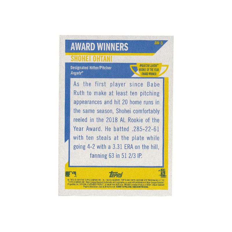 他の画像を見る MLB エンゼルス 大谷翔平選手トレーディングカード MLB 大谷翔平 エンゼルス トレーディングカード 2019 Topps Heritage Rookie Of The Year #AW-5 Topps ¥ 3,300 税込 在庫切れ カートに入れる お気に入りに登録する