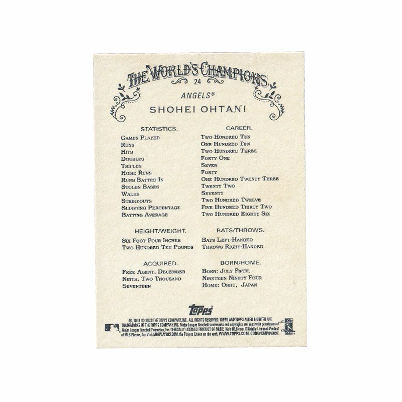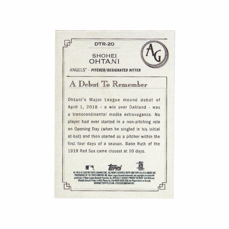 他の画像を見る MLB エンゼルス 大谷翔平選手トレーディングカード MLB 大谷翔平 エンゼルス トレーディングカード 2020 Allen Ginter A Debut to Remember #DTR-20 Topps ¥ 3,300 税込 在庫切れ カートに入れる お気に入りに登録する