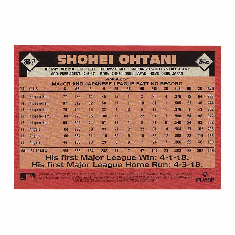 他の画像を見る MLB エンゼルス 大谷翔平選手トレーディングカード MLB 大谷翔平 エンゼルス トレーディングカード 2021 Update Series 1986 Anniversary #86B-27 Topps ¥ 3,300 税込 在庫切れ カートに入れる お気に入りに登録する