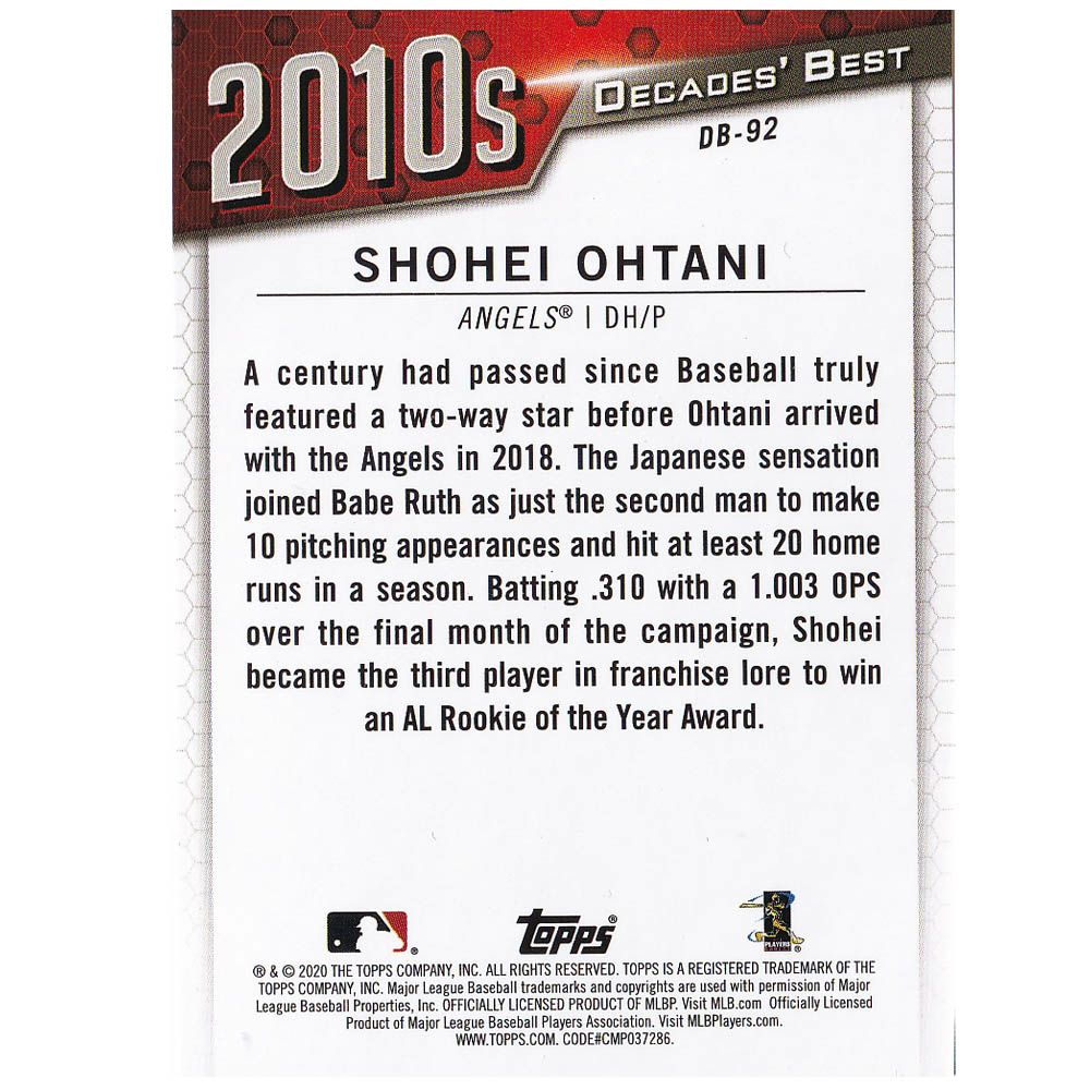 他の画像を見る MLBエンゼルス 大谷翔平選手トレーディングカード MLB 大谷翔平 エンゼルス トレカ トレーディングカード 2020 Series 1 Decades' Best #DB-92 Topps ¥ 3,300 税込 在庫切れ カートに入れる お気に入りに登録する