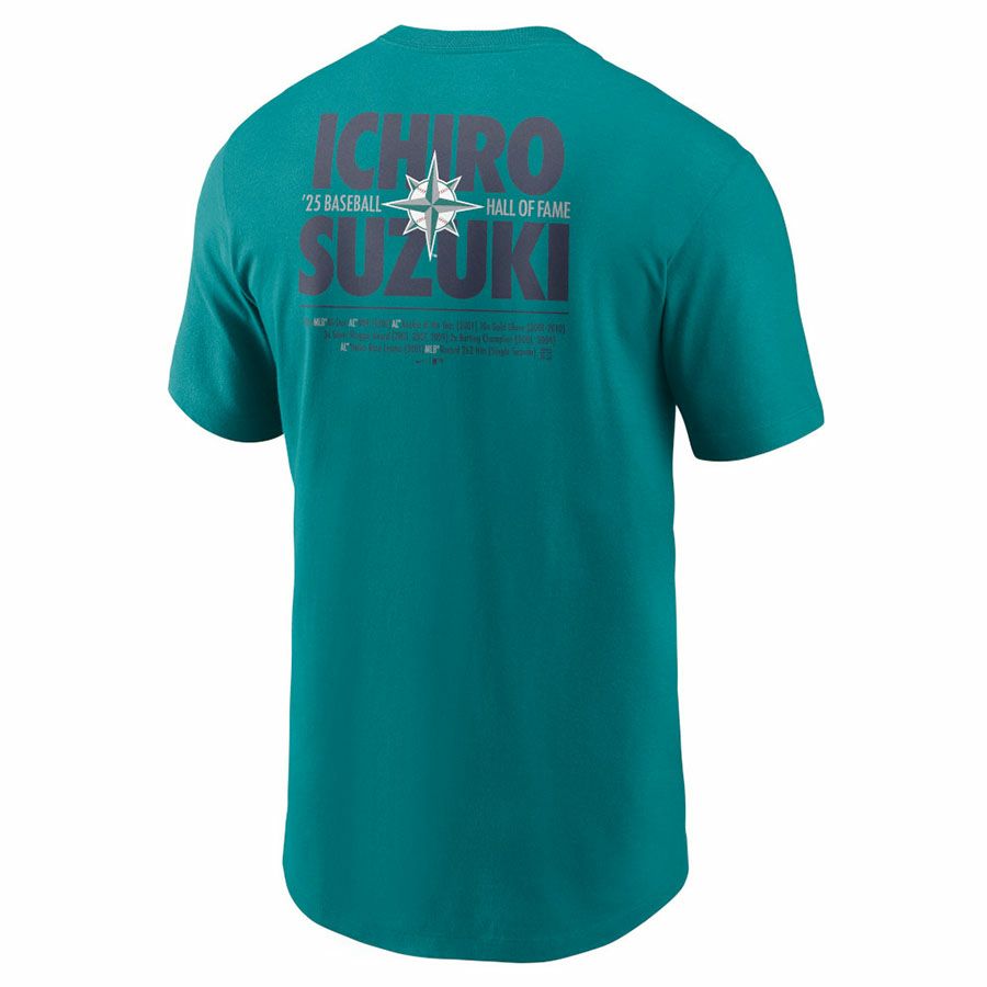 他の画像を見る イチロー選手 2025年 アメリカ野球殿堂入り記念アイテム MLB イチロー マリナーズ Tシャツ 2025 アメリカ野球 殿堂入り Hall of Fame Player Graphic T-Shirt ナイキ/Nike アクア ¥ 16,500 税込 カートに入れる お気に入りに登録する