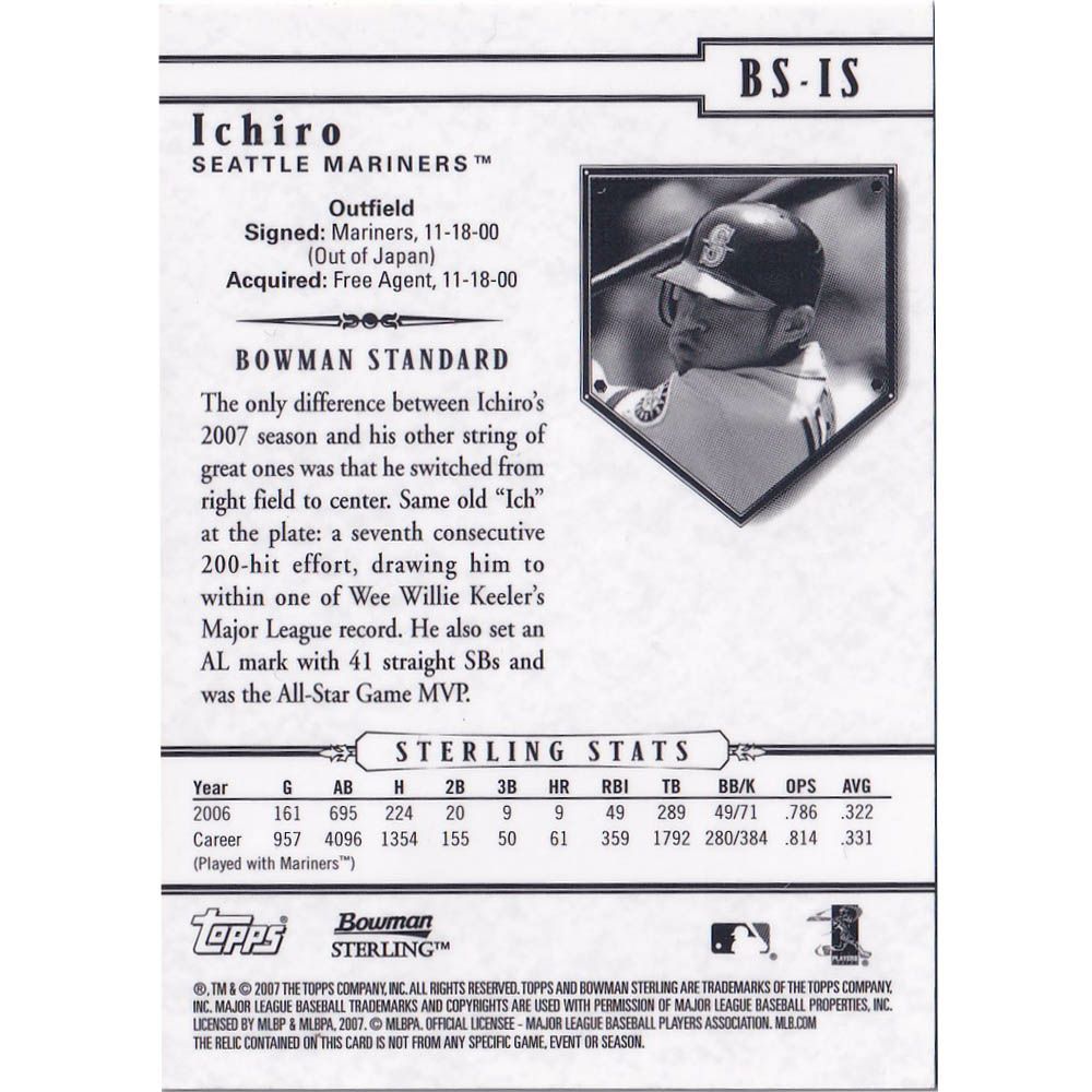 他の画像を見る イチロー選手愛用のバットの一部を封入した限定カード! MLB イチロー マリナーズ トレーディングカード/スポーツカード 2006 BOWMAN STERLING AUTHENTIC GAME USED BAT (BS-IS) TOPPS ¥ 13,200 税込 在庫切れ イチロー選手愛用のバットの一部を封入した限定カード! カートに入れる お気に入りに登録する